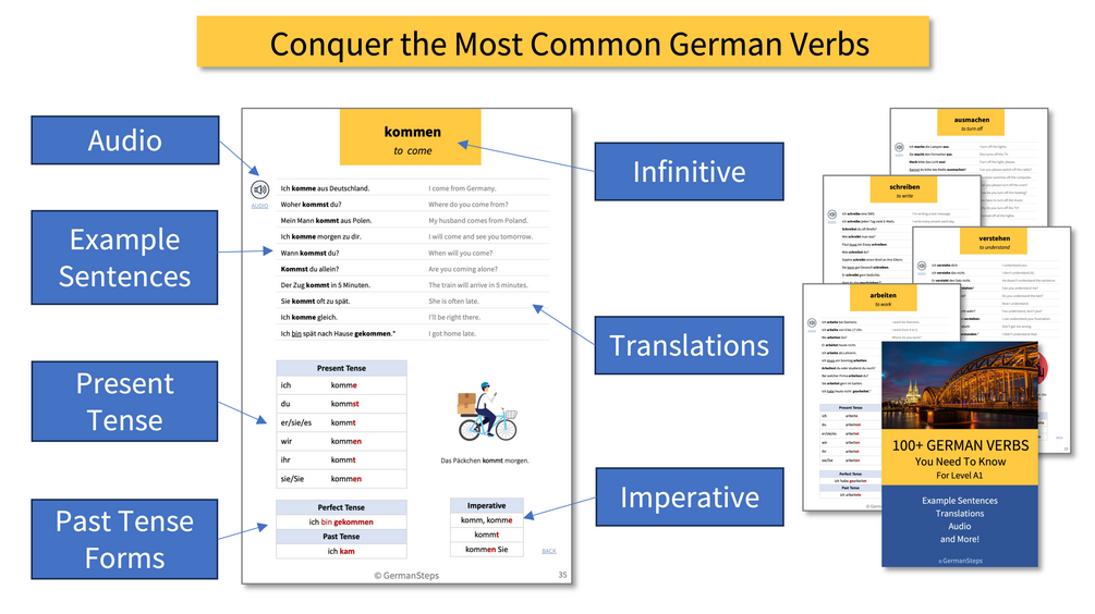 Whether you're aiming to improve your language skills for travel, work, or personal enrichment, "Essential German Verbs" will serve as your go-to resource for acquiring the foundational verbs necessary for fluency.